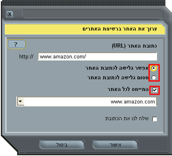 - אם ברצונכם לאפשר את כל כתובות האתר (האתר כולו) השתמשו גם בסימון "התייחס לכל האתר" ולחצו על "אישור".